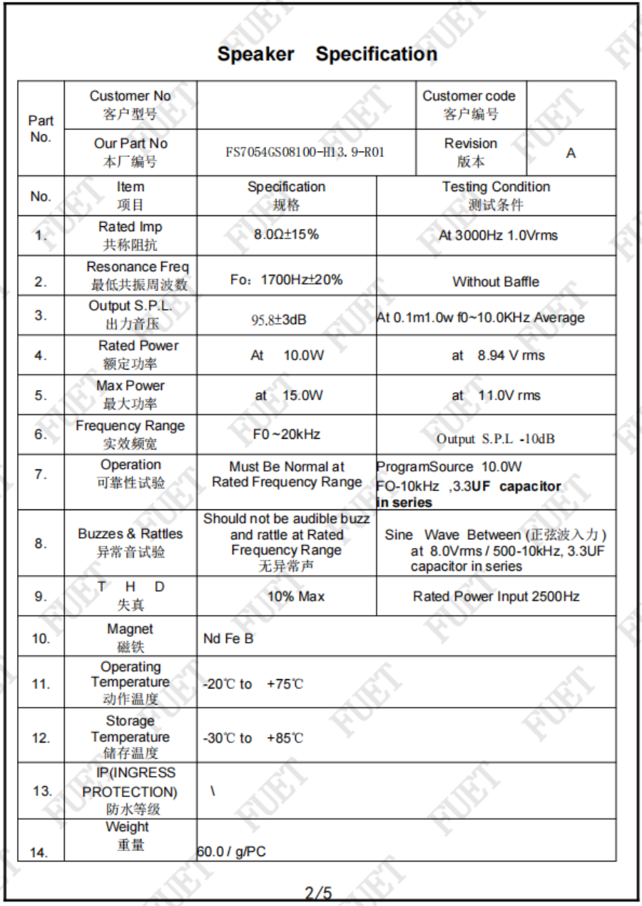 出力音压 95.8±3dB At 0.1m1.0w f0~10.0KHz Average